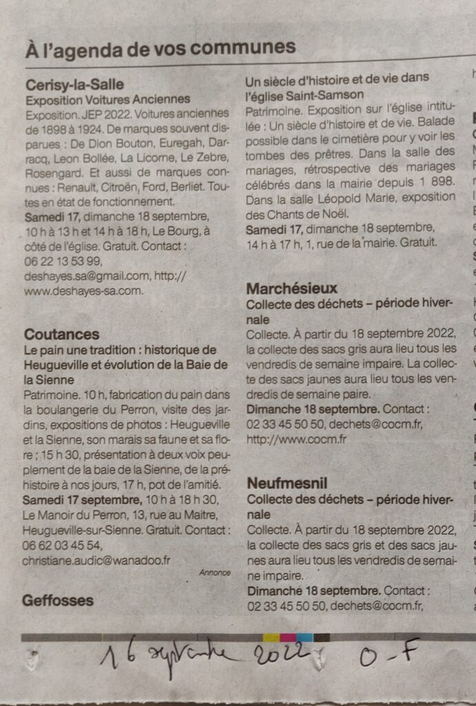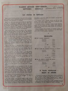 17 septembre 2022. Pendant les journées du patrimoine, l’Association présente une exposition sur la reconstruction en 1925 de l’église Saint-Samson, détruite par un incendie l’année précédente. C’est l’occcasion de présenter aux Geffossais une frise des mariages célébrés dans cette église.